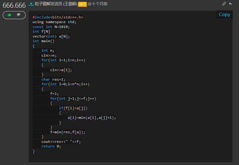 #include<bits/stdc++.h> using namespace std; const int N=1010; int f[N] vector<int> a[N]; int main() { int n; cin>>n; for(int i=1;i<n;i++) { cin>>a[i]; } char res=1; for(int i=0;i<n*n;i++) { f=1; for(int j=1;j<=f;j++) { if(f[i]<a[j]) { a[i]=min(a[i],a[j]+1); } } f=min(res,f[a]); } cout<<res<<" "<<f; return 0; } -